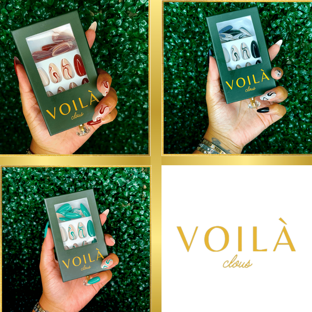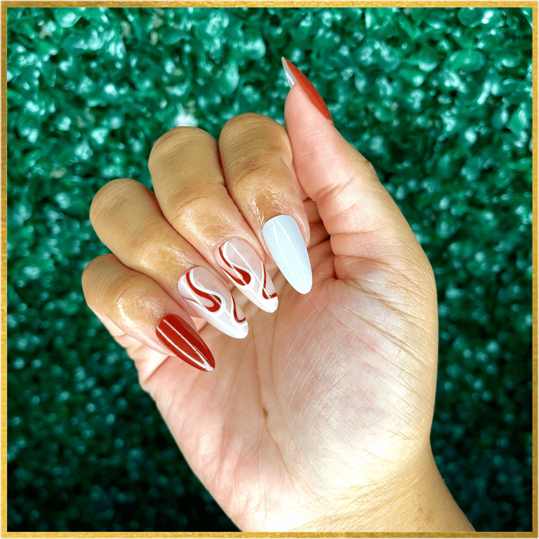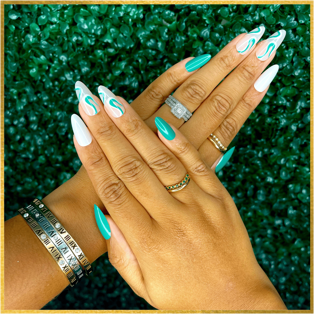 Our "Tourbillon" is a medium/ long almond shaped nail that features unique swirl designs with a splash of green and white, black and white, and wine and white.